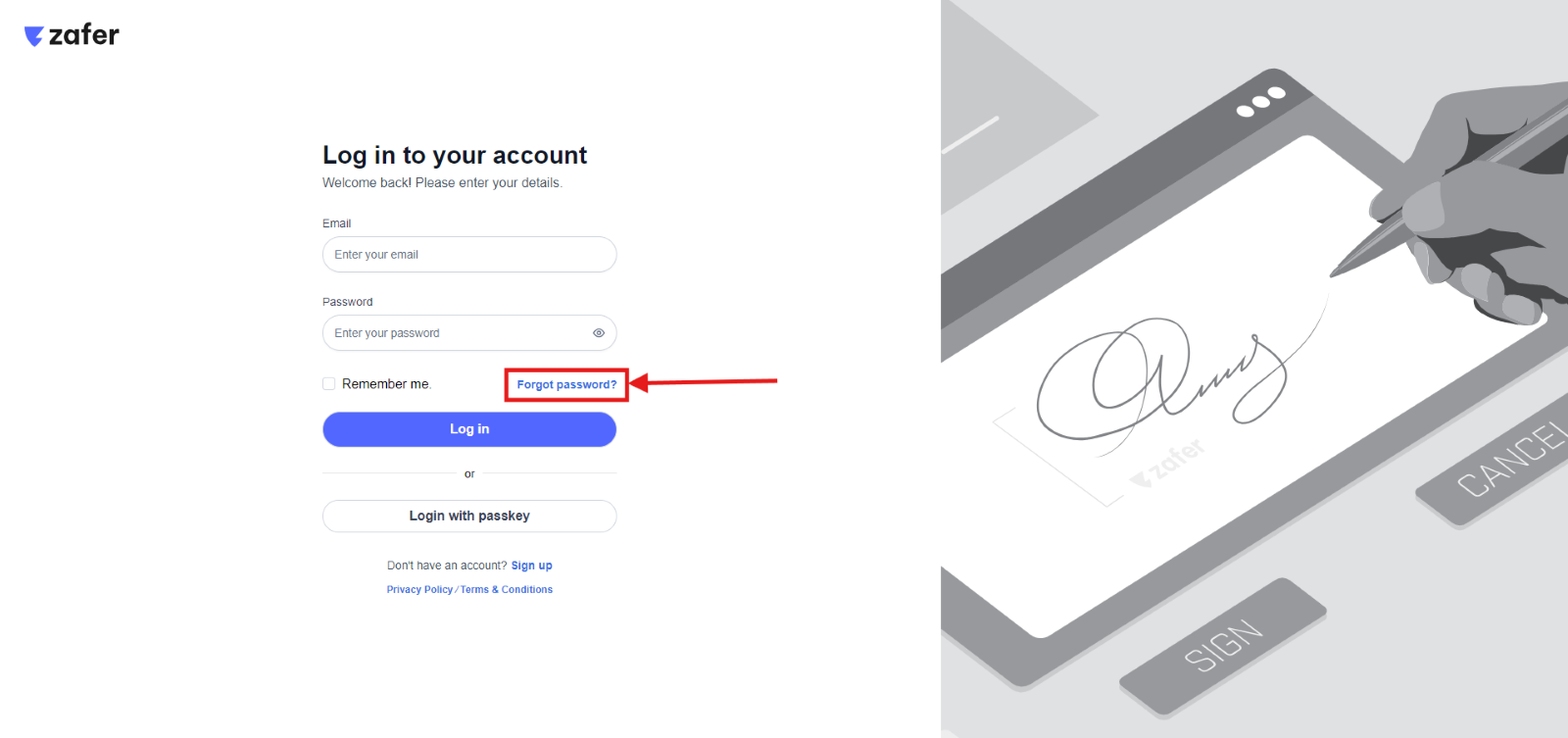 Click on the ‘Forgot Password?’ button displayed within the Zafer login page.